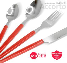 BRUNO σετ μαχαιροπίρουνα ανοξείδωτα Accorto, κόκκινο, 16τμχΣετ μαχαιροπίρουνα 16 τεμαχίων Accorto από την BRUNO, με πλαστική λαβή, κατασκευασμένα από ανοξείδωτο ατσάλι σε μοντέρνο σχέδιο και φινίρισμα "καθρέφτη". Διατίθενται σε έξυπνη σύνθεση 16 τεμαχίων ώστε συνδυαστικά να καλύπτουν κάθε ανάγκη. 1...