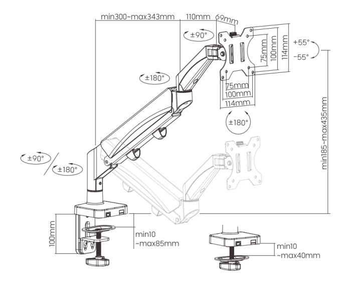 Πάχος επιφάνειας εργασίας: Clamp: 10~85mm, Grommet: 10~40mm