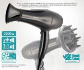 Διαθέτει δυνατό μοτέρ μεγάλης ισχύος, ρυθμίσεις ταχύτητας, θερμοκρασίας αέρα και cool shot για άψογο αποτέλεσμα. Με στόμιο φορμαρίσματος και φυσούνα για έχτρα όγκο καλύπτει κάθε ανάγκη. Ιδανικό για καθημερινή χρήση, ελαφρύ και άνετο στην χρήση, με εργονομικά σχεδιασμένη λαβή για αριστερόχειρες και δεξιόχειρες, μακρύ καλώδιο , γάντζο ανάρτησης και αφαιρούμενο φίλτρο εισαγωγής αέρα για ευκολότερο καθαρισμό.