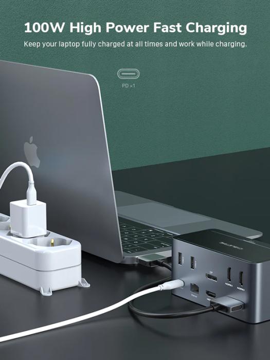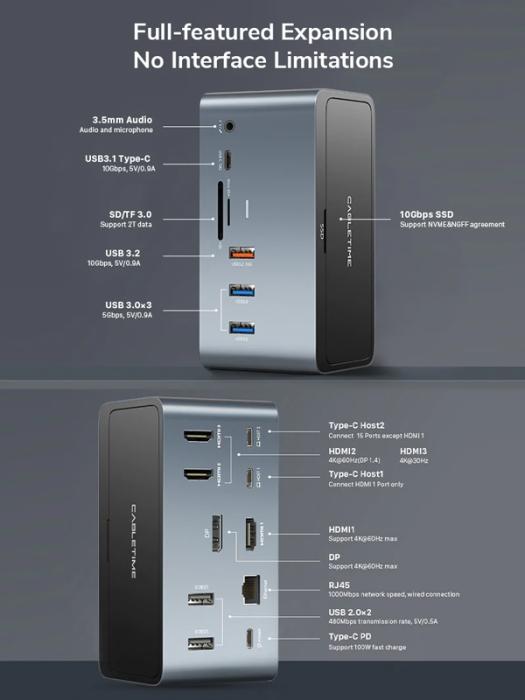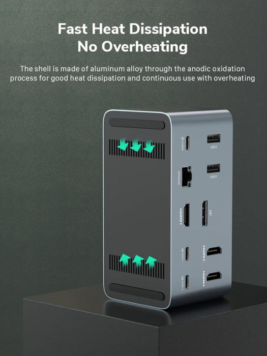 Εξοπλίζεται με 15 θύρες και θήκη στο επάνω μέρος του για M.2 NVME SSD με χωρητικότητα έως 2TB. Μέσω της θύρας RJ45 σας επιτρέπει την ενσύρματη σύνδεση στο δίκτυο με ταχύτητες έως 1000Mbps ενώ μέσω της θύρας USB-C PD μπορείτε να φορτίσετε το laptop σας με απόδοση έως 100W. Επιπλέον, υποστηρίζει MST λειτουργία χάρη στην οποία, καθιστά δυνατή, την ταυτόχρονη σύνδεση οθονών από τις θύρες HDMI και DisplayPort (υποστηρίζεται επέκταση οθόνης).