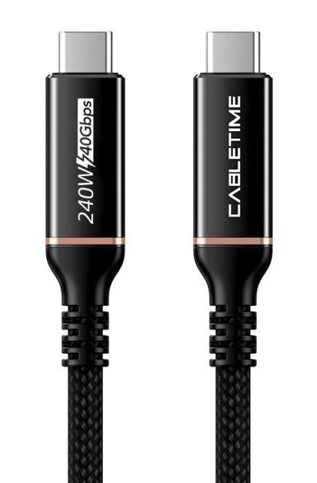 Καλώδιο φόρτισης και μεταφοράς δεδομένων USB-C σε USB-C της Cabletime. Υποστηρίζει φόρτιση με απόδοση έως 240W, μεταφορά δεδομένων με ταχύτητα έως 40Gbps και μεταφορά εικόνας με ανάλυση έως 8K.