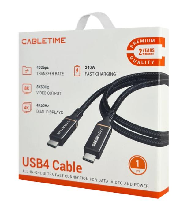 CABLETIME καλώδιο USB-C σε USB-C CT-USB4, 240W, 40Gbps, 8K/60Hz, USB4, 1m, μαύρο