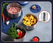 Επιπλέον, διαθέτει 3 ανοξείδωτα δοχεία σε διαφορετικό μέγεθος, τα όποια μπορείτε να εναλλάξετε εύκολα, ανάλογα με τη χρήση του πολυκόφτη.