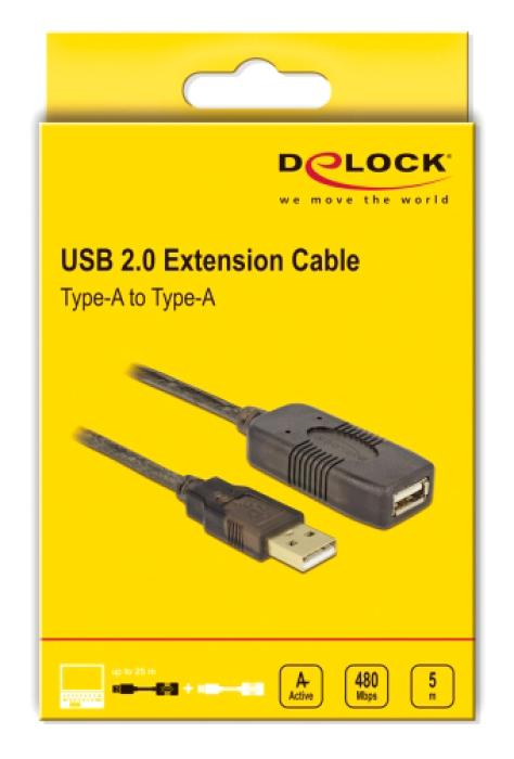 DELOCK καλώδιο USB 2.0 αρσενικό σε θηλυκό 82308, active, 5m, μαύρο