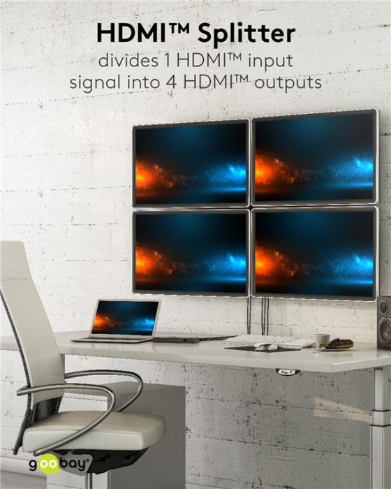 Το HDMI splitter της Goobay σας επιτρέπει την σύνδεση 1x συσκευής εισόδου όπως PC σε 4x συσκευών εξόδου όπως οθόνες.