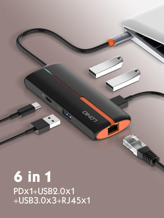 LDNIO USB hub DS-26U με θύρα δικτύου, 6 θυρών, USB-C σύνδεση, 100W PD, λευκό