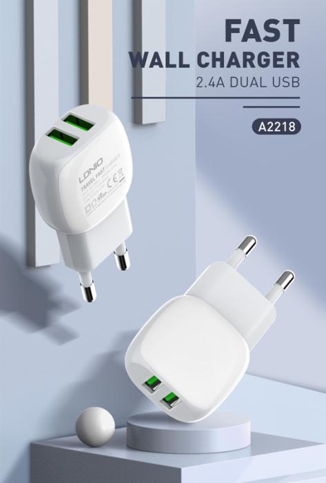 LDNIO φορτιστής τοίχου A2218 με καλώδιο USB-C, 2x USB, 12W, λευκός