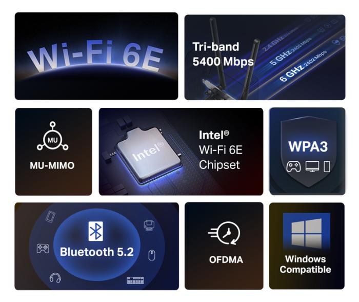 Η κάρτα δικτύου MA86XE της Mercusys συνδέεται στον υπολογιστή σας μέσω PCIe υποδοχής δίνοντας σας την δυνατότητα να συνδεθείτε ασύρματα στο δίκτυο με γρήγορες ταχύτητες Wi-Fi 6E έως 5.4Gbps. Επιπλέον, προσφέρει στον υπολογιστή σας τεχνολογία Bluetooth 5.2, που σας επιτρέπει να συνδέσετε ασύρματα στον υπολογιστή, συσκευές Bluetooth, όπως ποντίκια και πληκτρολόγια.