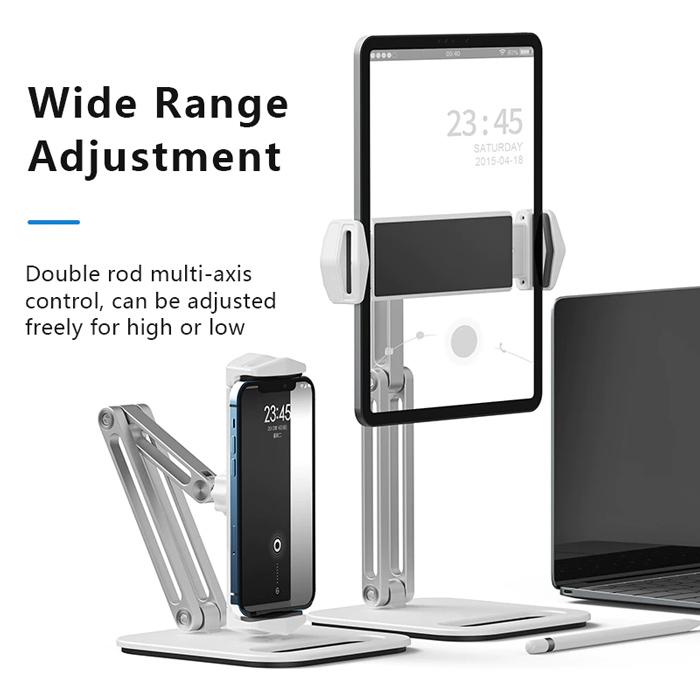 Μεταλλική βάση, συμβατή με tablet και smartphone από 4" έως 13". Διαθέτει μετακινούμενο βραχίονα που επιτρέπει να προσαρμόσετε την συσκευή σας στην ιδανική γωνία θέασης.
