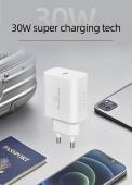 Υψηλής απόδοσης φορτιστής τοίχου της Powertech, κατασκευασμένος από ανθεκτικό υλικό και συμβατός με συσκευές που φορτίζουν μέσω θύρας USB-C. Διαθέτει USB-C θύρα εξόδου που υποστηρίζει φόρτιση με μέγιστη απόδοση 30W.