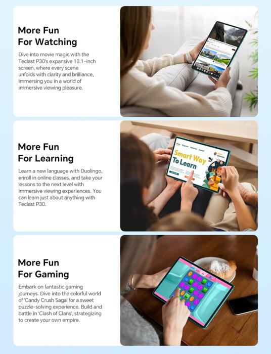 Το tablet P30 της Teclast συνδυάζει εντυπωσιακές επιδόσεις και εκλεπτυσμένο σχεδιασμό. Με μεγάλη οθόνη 10.1", ευέλικτο σύστημα λειτουργικού Android 14 και ισχυρό οκταπύρηνο επεξεργαστή, το P30 προσφέρει υψηλή απόδοση, για απρόσκοπτη περιήγηση στο διαδίκτυο, παιχνίδια, πολυμέσα και πολλά άλλα.