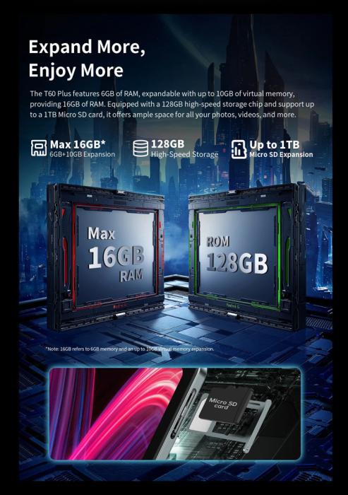 Εξοπλισμένο με επεξεργαστή 8 πυρήνων και λειτουργικό Android 14, το T60 Plus προσφέρει υψηλή απόδοση για απρόσκοπτη περιήγηση στο διαδίκτυο, παιχνίδια, πολυμέσα και πολλά άλλα.