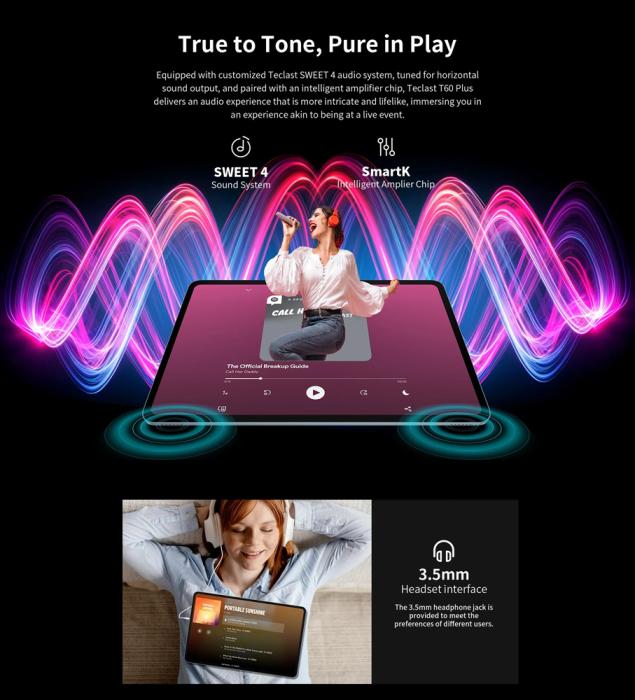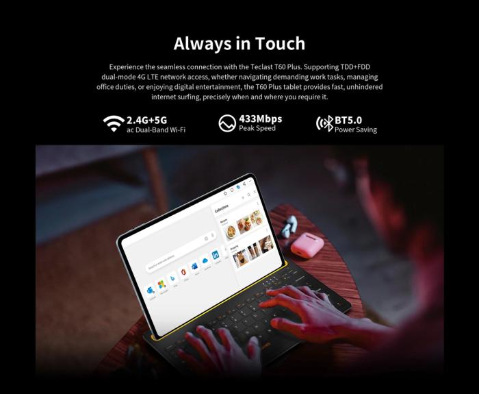 Με υποστήριξη διπλής κάρτα SIM και δικτύου 4G, το tablet T60 Plus σας επιτρέπει να παραμείνετε συνδεδεμένοι όπου κι αν βρίσκεστε. Επιπλέον, η τεχνολογία WiFi σας εξασφαλίζει γρήγορη και αξιόπιστη ασύρματη σύνδεση.