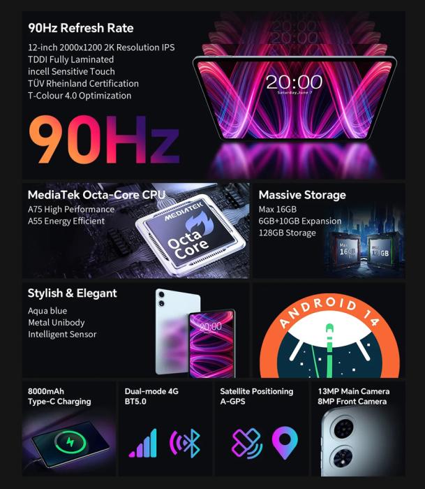 TECLAST tablet T60 Plus, 12", 6/128GB, 4G, Android 14, 8000mAh, μπλε