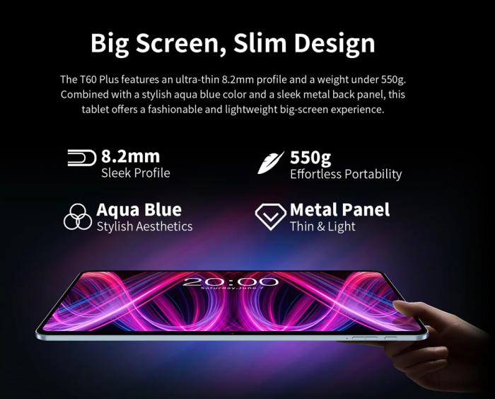 Με ελαφρύ και λεπτό μεταλλικό σώμα, το tablet T60 Plus είναι άνετο στη χρήση και εύκολο να μεταφέρεται παντού.
