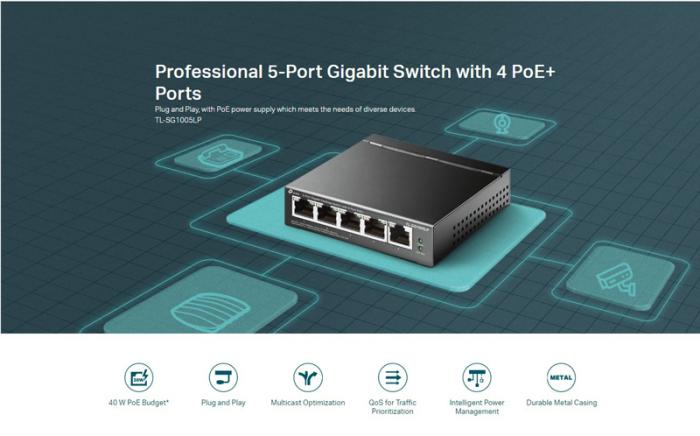 Το TL-SG1005LP είναι ένα switch επαγγελματικών προδιαγραφών που εξοπλίζεται με 5 θύρες δικτύου με ταχύτητες 10/100/1000Mbps. Από τις θύρες δικτύου που εξοπλίζεται, οι 4 υποστηρίζουν PoE+ για την μεταφορά δεδομένων και ισχύς με ένα μόνο καλώδιο.