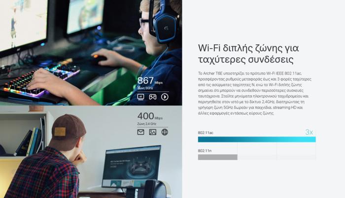 Το Archer T6E υποστηρίζει το πρότυπο Wi-Fi IEEE 802.11ac, προσφέροντας ρυθμούς μεταφοράς έως και 3 φορές ταχύτερες από τις ασύρματες ταχύτητες N, ενώ το Wi-Fi διπλής ζώνης σημαίνει ότι μπορούν να συνδεθούν περισσότερες συσκευές ταυτόχρονα. Στείλτε μηνύματα ηλεκτρονικού ταχυδρομείου και περιηγηθείτε στον ιστό με το δίκτυο 2,4GHz, διατηρώντας τη γρήγορη ζώνη 5GHz δωρεάν για παιχνίδια, streaming HD και άλλες εφαρμογές εντάσεως εύρους ζώνης.