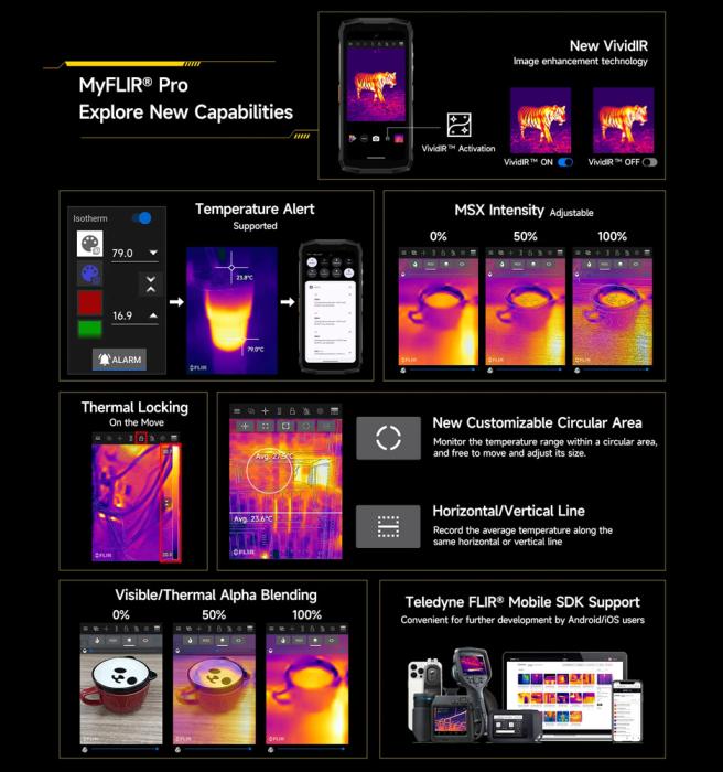 -Θερμική εικόνα: Thermal by FLIR. Thermal Resolution: 160x120. Frame Rate: 25Hz. Pixel Pitch: 12μm. Sensitivity: <50mk. Measurable Temperature Range: -10 °C to 450 °C, Accuracy: +/- 3 °C.