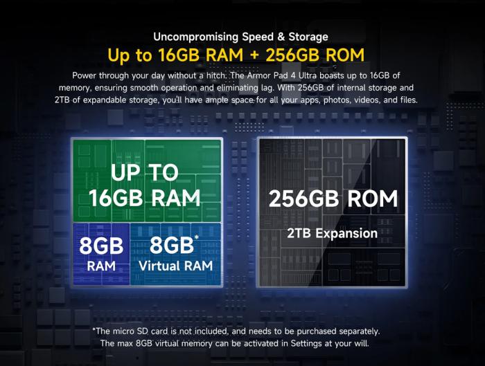 Εξοπλισμένο με επεξεργαστή 8 πυρήνων και λειτουργικό Android 14, το Armor Pad 4 Ultra προσφέρει υψηλή απόδοση για απρόσκοπτη περιήγηση στο διαδίκτυο, παιχνίδια, πολυμέσα και πολλά άλλα.