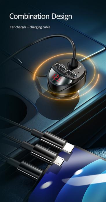 USAMS φορτιστής αυτοκινήτου C22 με καλώδιο 3 σε 1 & οθόνη, 3.4A, μαύρος