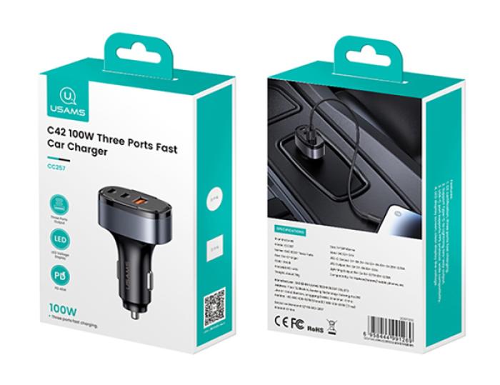 USAMS φορτιστής αυτοκινήτου US-CC257, USB/USB-C/Lightning, 100W, γκρι