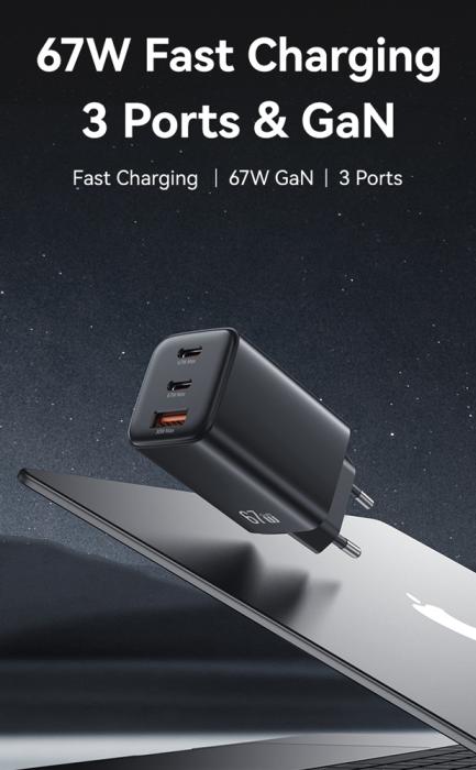 USAMS φορτιστής τοίχου CC265, USB & 2x USB-C, 67W, GaN, μαύρος