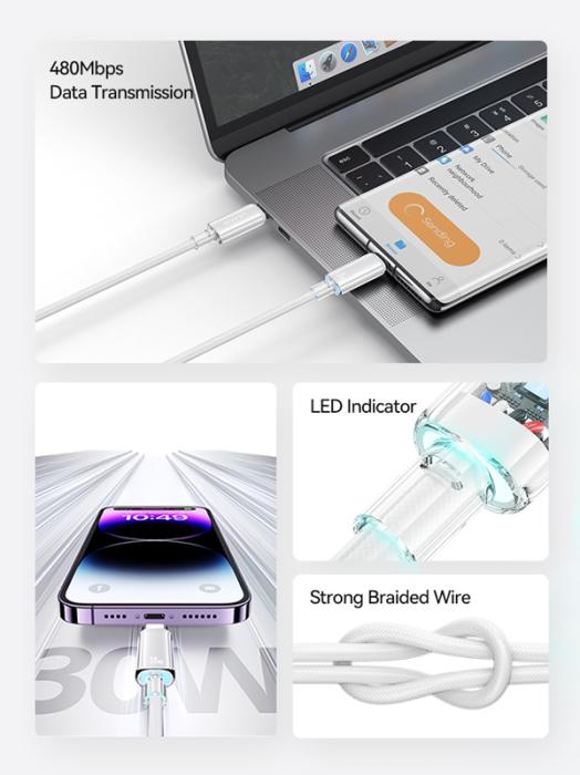 USAMS καλώδιο Lightning σε USB-C US-SJ659, 30W, 480Mbps, 1.2m, λευκό